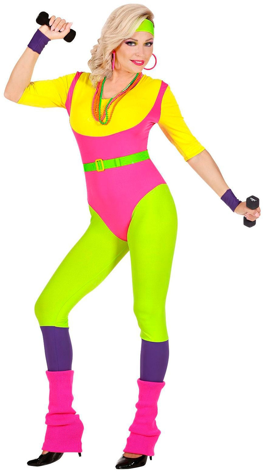Jaren 80 Aerobics pakje voor het echte jaren 80 gevoel met neon kleuren, het pakje is zeer compleet met een jumpsuit, zweetband, polsbandjes en neon riem, een leuke pruik is los bij te bestellen en zal deze outfit helemaal compleet maken