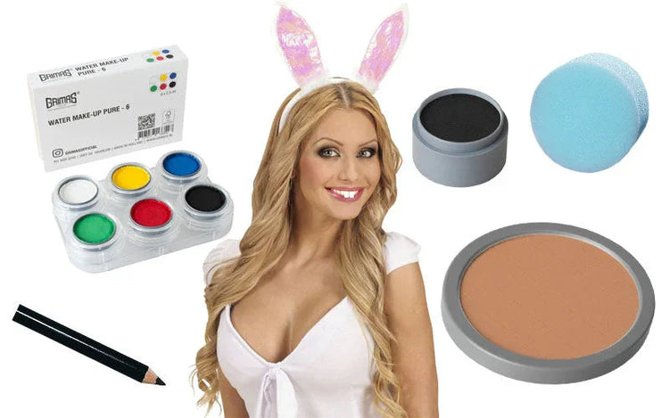 Wil je een echte paashaas op bezoek en je kiest voor een pak met een capuchon, dan is het leuk ook de paashaas ook te schminken, een licht bruine ondergrond met witte accenten en zwarte lijntjes. De hazentandjes maken de het plaatje helemaal compleet.