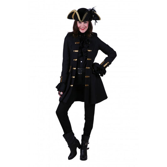 Luxe piratenjas zwart: deze piratenjas is perfect getailleerd, een echt damesmodel met een luxe afwerking, het goudgalon en de zeer fraaie knopen maken de jas als geheel een prima aankoop met een zeer goede prijs-kwaliteit verhouding