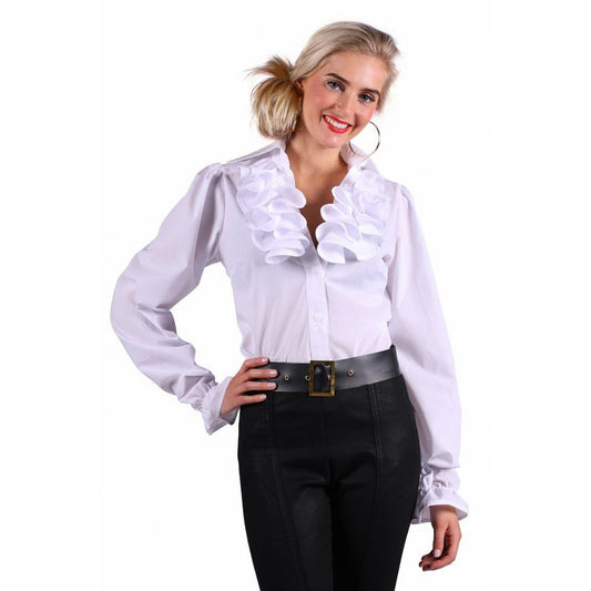 Witte piratenblouse voor dames: een echte piratenblouse met uitlopende mouwen en touwtjes aan de bovenzijde zoals het hoort bij een stoere piratenvrouw. De blouse is zo te dragen maar ook perfect te combineren met een mooie brede riem.