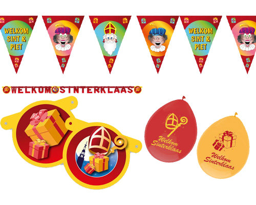 Om het Sinterklaasfeest extra leuk te maken moet de ruimte voor ontvangst natuurlijk worden versierd met Sint en Piet decoratie. Onder Sint en Piet decoratie verstaan we de sinterklaas vlaggenlijnen en zwaaivlaggetjes. Dit kun je onder andere gebruiken om Sinterklaas te verwelkomen. Ook de banners met vrolijke afbeeldingen zijn leuk om op te hangen. De tekst Welkom Sinterklaas zal onze goedheiligman erg waarderen, waar hij ook komt. De vlaggenlijnen zijn er van 6, 8 of 10 meter. Het is toch een geweldig gezicht als alle kinderen lopen te zwaaien met een vlaggetje in hun handen bij aankomst of binnenkomst van Sinterklaas. We hebben meerdere zwaaivlaggen maar de vlaggen met 'Welkom Sinterklaas' geven toch wel een warm ontvangst.