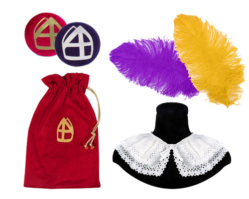 Een pietencol is vooral praktisch en beschermt het pak tegen schmink, bovendien hoef je niet helemaal tot onder je hals te schminken. Een piet zonder veer is geen piet, dus één of liefst twee gekleurde spadonis veren maken het pak compleet. Verder kun je kiezen voor schoengespen, manchetten en baretspelden. Nieuw zijn onze baretspelden met mijter, net als in het Sinterklaasjournaal.