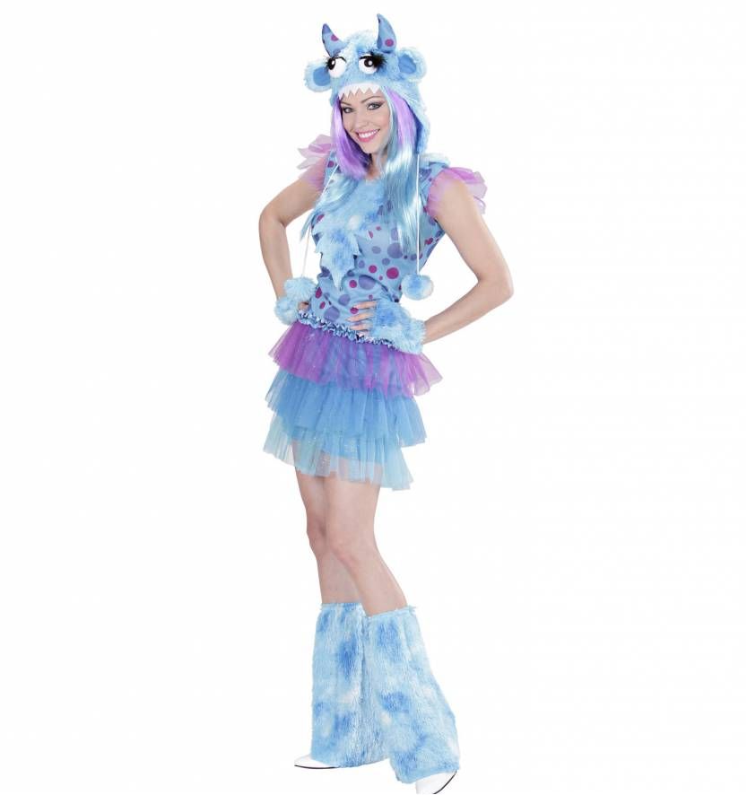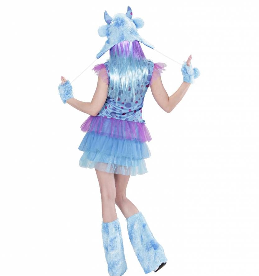 Blauw Monstermeisje is alles behalve een monster om te zien, het monsterpakje is zeer compleet en bestaat uir een jurkje, de muts, beenwarmers en handschoenen, kortom een compleet pakje om naar het feest te gaan, een paar leuke panty's zou het pakje nog helemaal compleet kunnen maken, het mosterpakje is verkrijgbaar in verschillende kleuren