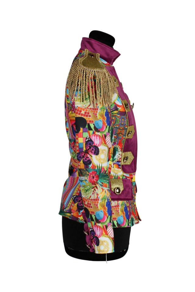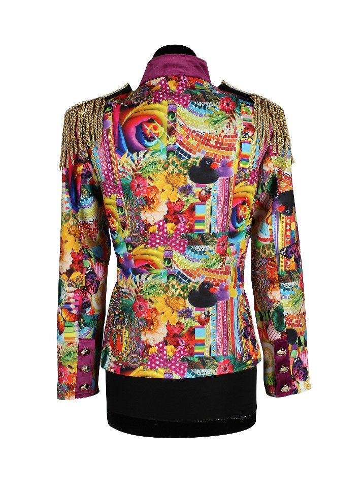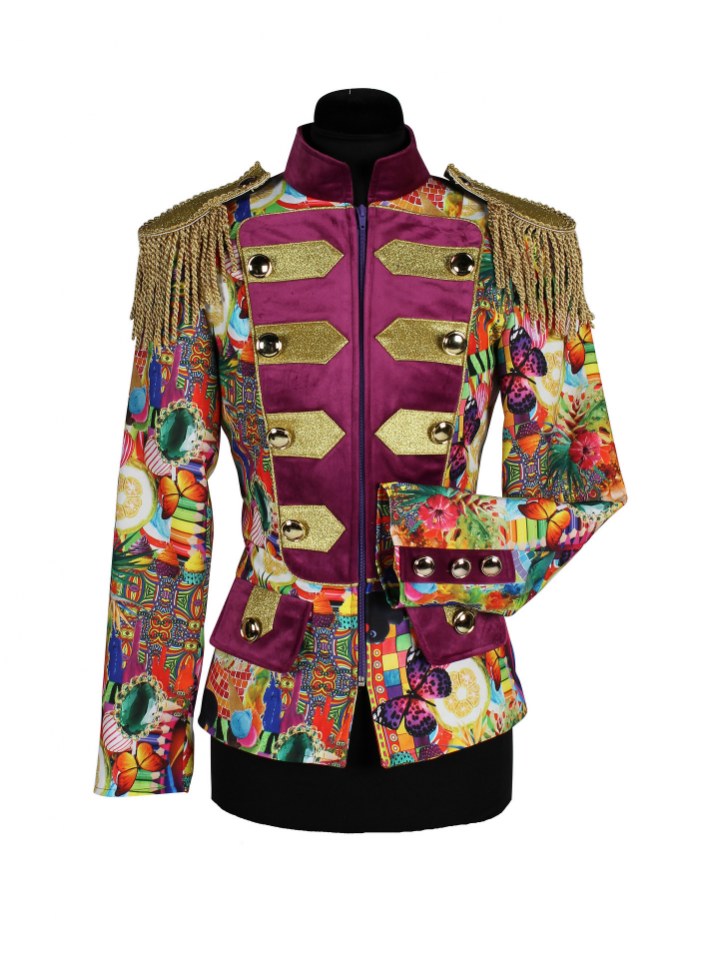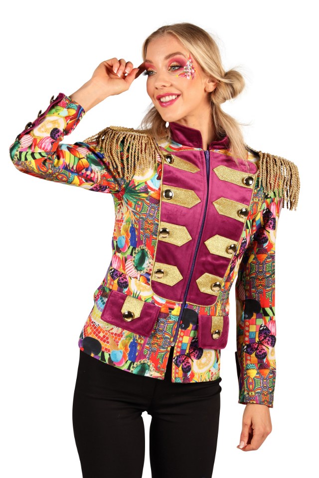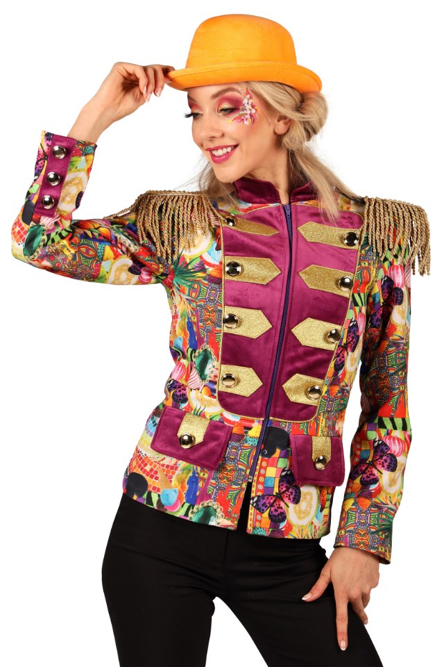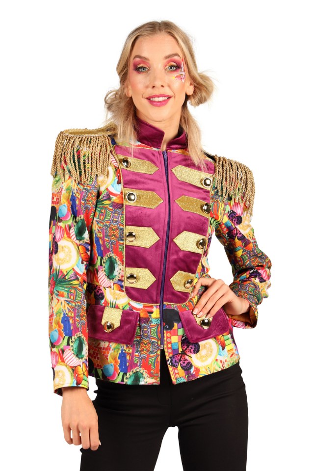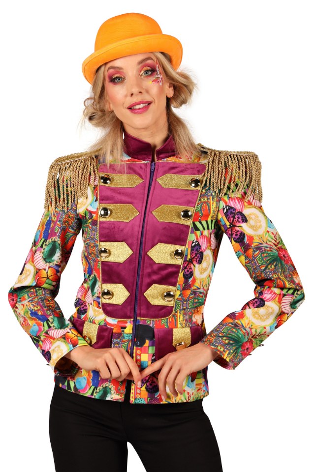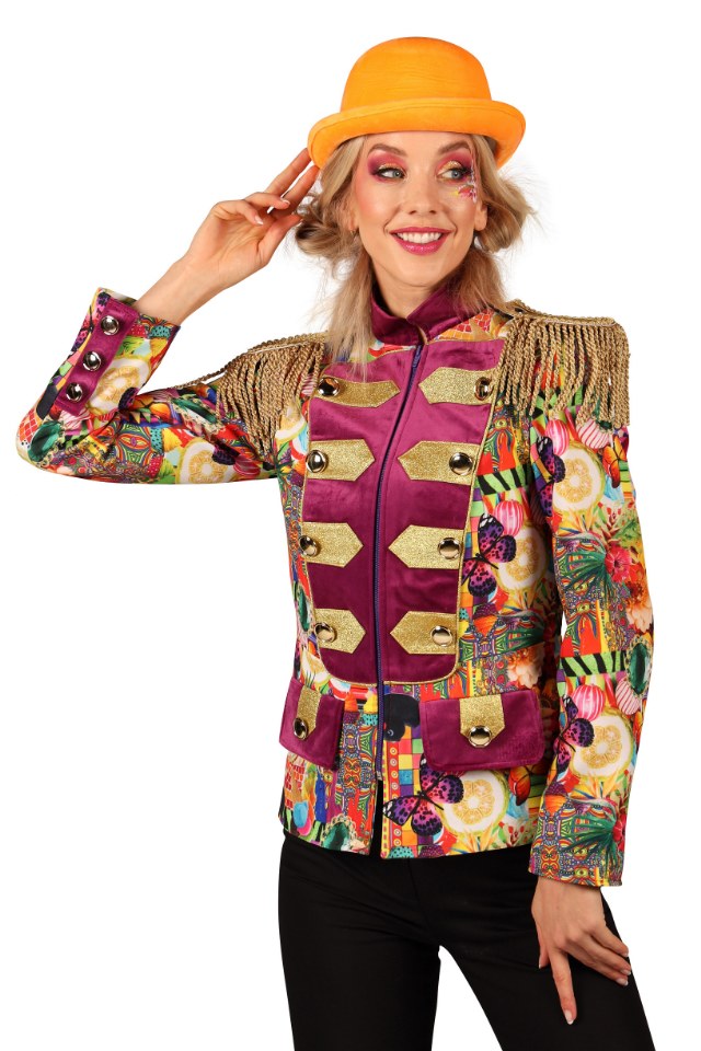 Deze prachtige damesjas is een echte eyecatcher voor carnaval! Met zijn levendige, kleurrijke patroon en verfijnde afwerking is deze jas een must-have voor elke feestganger die op zoek is naar een unieke look.