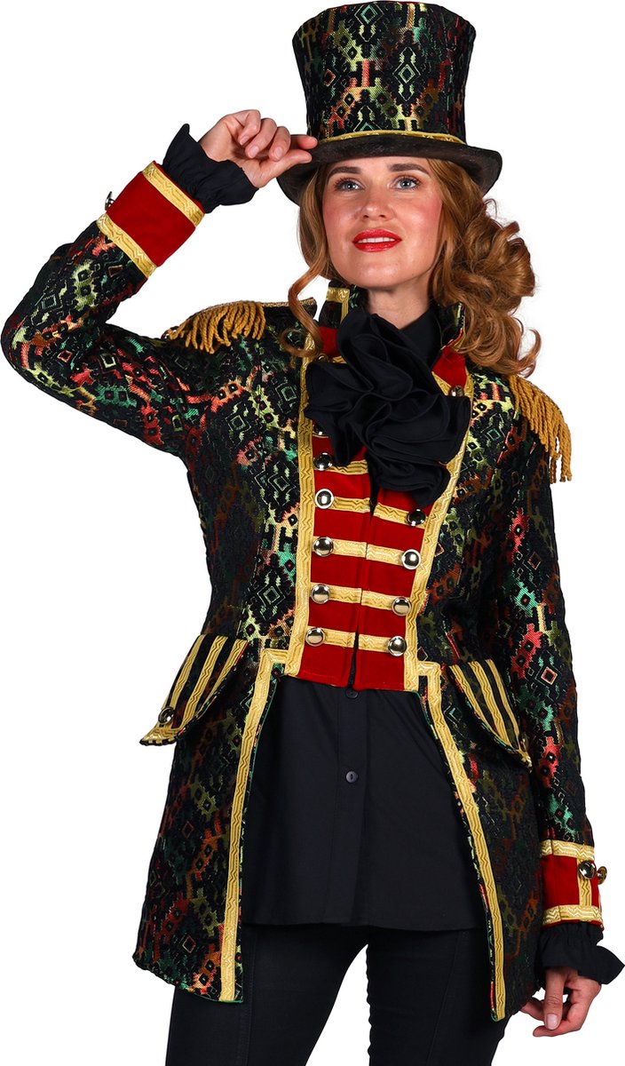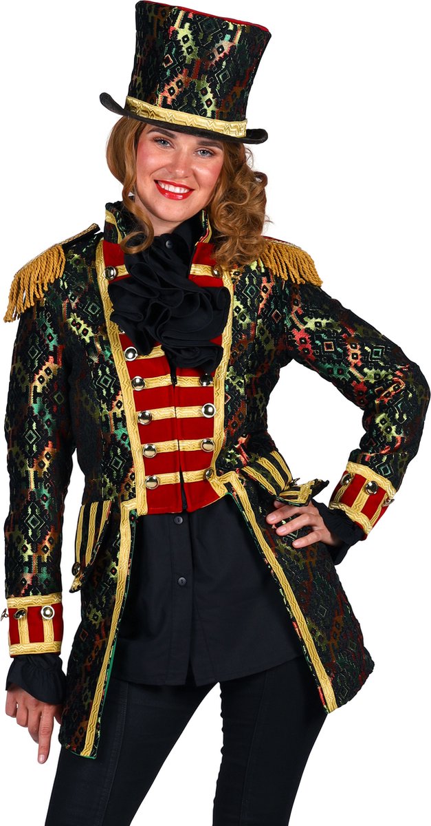 Carnaval in deze zeer luxe carnavalsjas voor dames. Met zijn holografische groene glans en gouden details is deze jas een echte blikvanger tijdens het feestje. Het goudband en de epauletten geven de jas een koninklijke uitstraling, terwijl de ritssluiting zorgt voor ultiem draagcomfort.