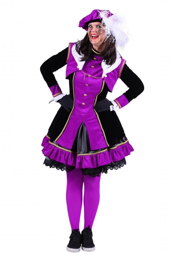Dames Pietenpak Graciosa in de combinatie paars-zwart is een pietenpak met een echte dames uitstraling, een mooi afgewerkte jurk met een kraagje en afneembare manchetten en een bijpassende baret, dit alles gemaakt van fraaie polyester fluweel