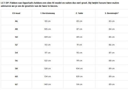 Kleding zoals pakken en blouses van opposuits vallen niet groot en zijn fraai getailleerd, dus bij twijfel de grootste maat kiezen.