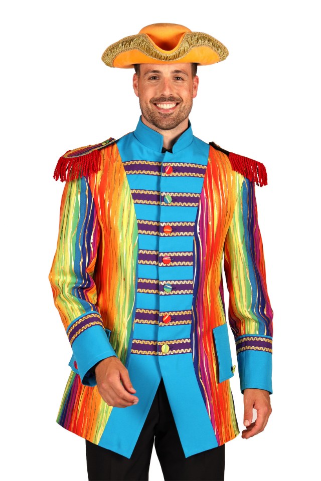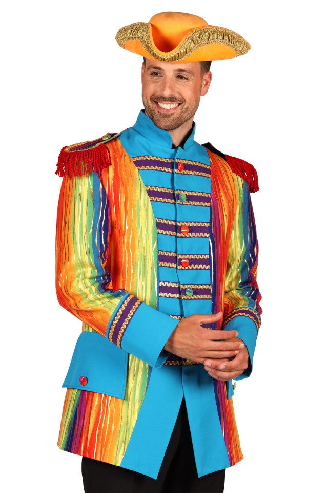 De herenjas Rainbow Gold is een luxe en stijlvolle carnavalsjas met een uniek regenboog motief. Met prachtige kleuren en een opvallend design is dit een perfecte jas voor carnaval.