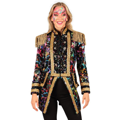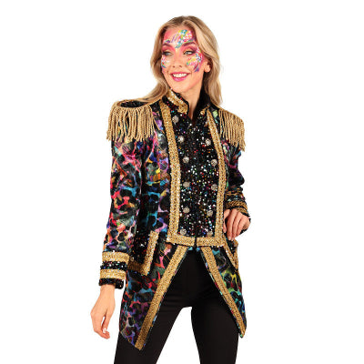 Met een getailleerde pasvorm, decoratieve knopen en een stijlvolle voering combineert deze jas elegantie met carnaval. Draag hem met een zwarte broek of petticoat, een feestelijke blouse of opvallende accessoires voor een perfecte Painted Black-look.