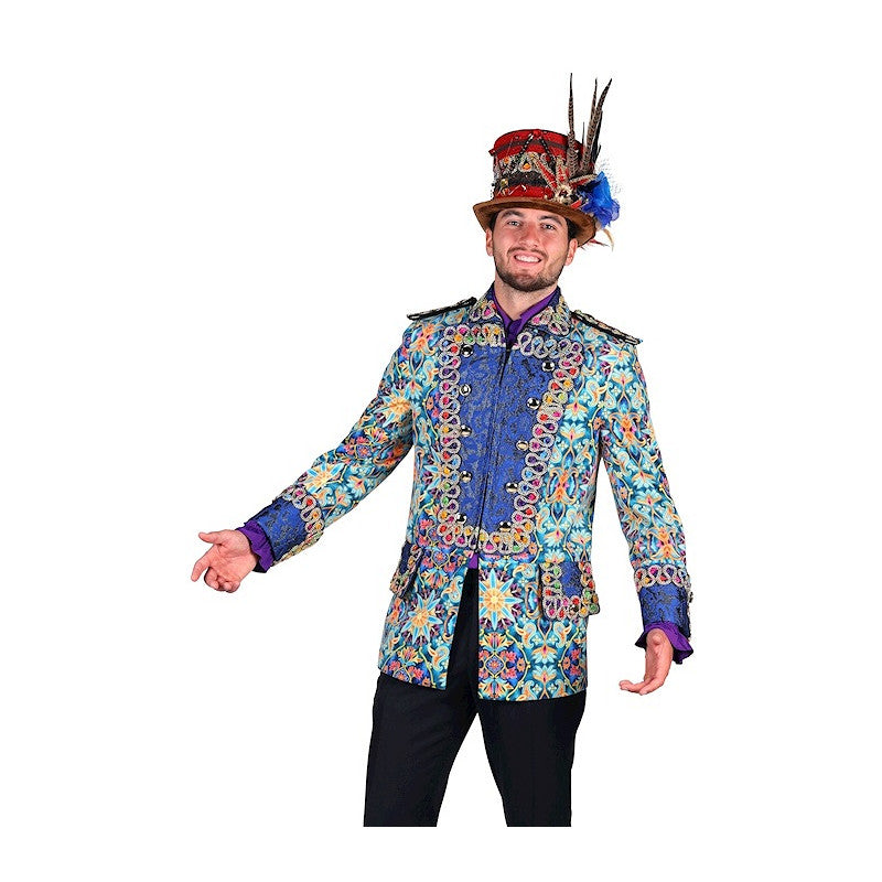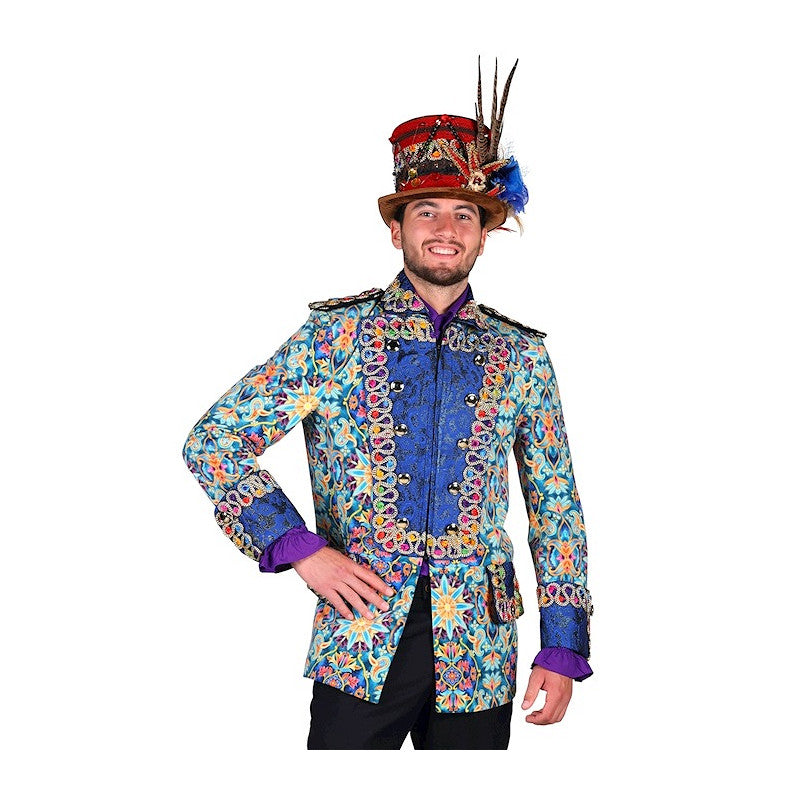 De jas heeft een stijlvolle snit met decoratieve knopen en een subtiel glanzende afwerking. Zo combineert hij het beste van twee werelden: de elegantie van een kostuumjas en de feestelijke flair van carnavalskleding.