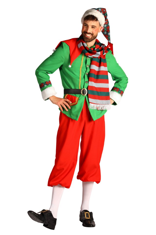 Een geweldig Kerstelf kostuum voor heren dat bestaat uit de jas, kniebroek, muts, riem en shawl. Een erg origineel model met in klassiek kerstkleuren en zeer fraaie bontraden. Dit Kerst elf kostuum mag niet ontbreken als begeleider bij de Kerstman. Een paar mooie rode gestreepte kousen maken het kostuum helemaal compleet