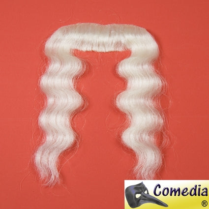 Een Sinterklaassnor van buffelhaar op tule. De doorzichtige tule is gemakkelijk op een droge huid te plakken met Mastix baardlijm. De buffel haren hebben een natuurlijke uitstraling en de snor wordt geleverd met golvende slag. Voordeel van een buffel snor (yakhaar) is dat de snor met een warme tang weer volledig kan worden opgemaakt. Dit kun je het beste door een specialist laten doen.